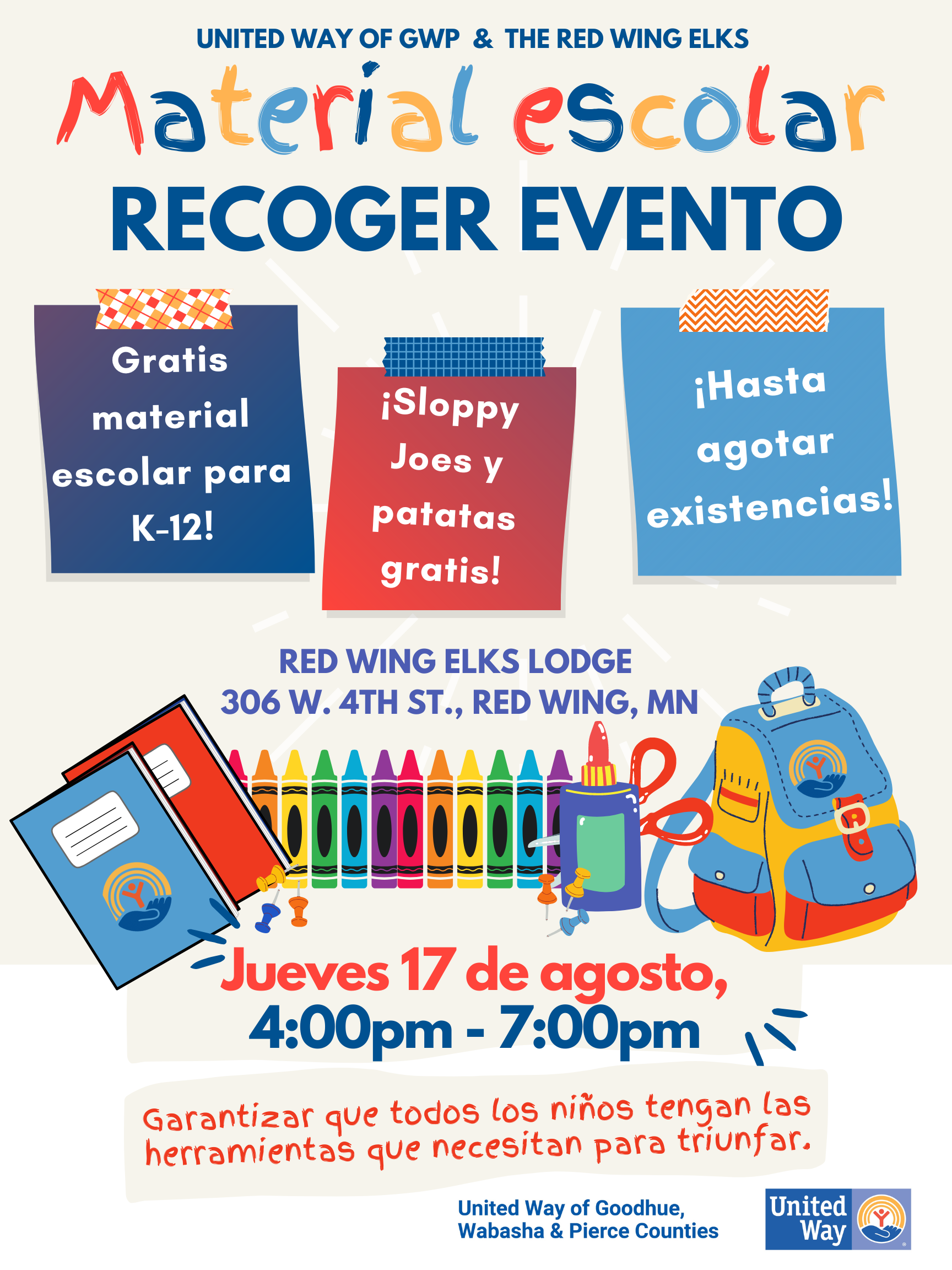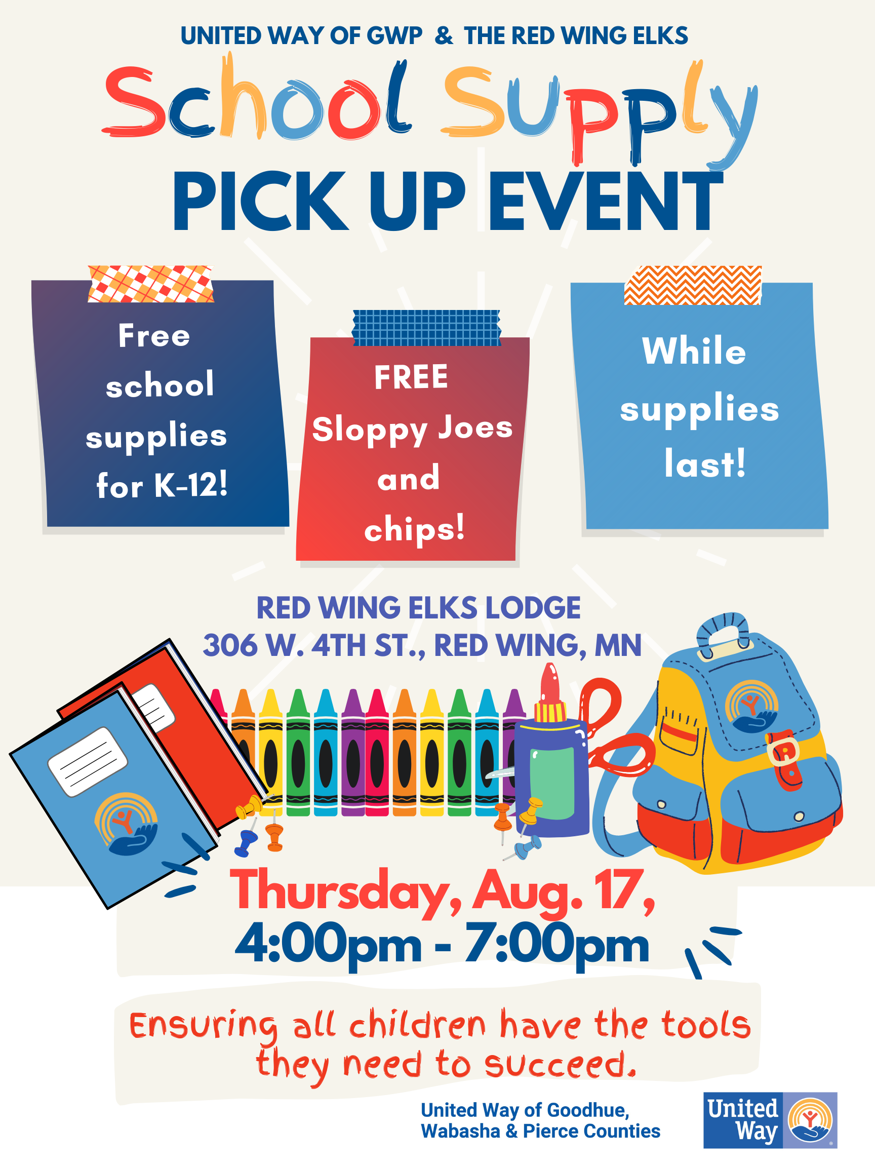 United Way's School Supply Drive Stuff the Bus 2023 To Pick Up School Supplies for your child please see the details below.